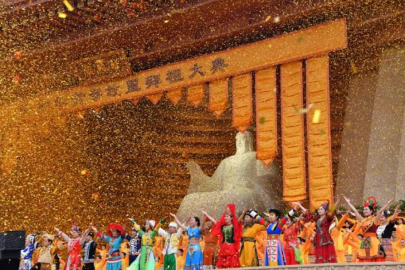 海内外华夏儿女循着祖先的足迹,再次汇聚黄帝故里,共拜始祖轩辕黄帝,祈福祖国繁荣昌盛,祝愿世界和平和睦。 大典共有九项仪程: 盛世礼炮 全体肃立,鸣炮21响。 敬献花篮 国家领导人,河南省委、省政府主要领导,主办单位领导,郑州市、新郑市领导,依次向黄帝像敬献花篮。 净手上香 礼仪人员手捧盛装黄河水的容器恭迎嘉宾,港澳台各界知名人士和来自世界各地的优秀华人代表净手为轩辕黄帝敬香。 行施拜礼 现场人员面向黄帝像,深深三鞠躬,表达炎黄子孙对文明始祖的无限尊崇。 恭读拜文 “中华文明,源远流长。我祖勋德,泽被八方。教民耕牧,莳谷树桑。婚丧有礼,典制有章……”十二届全国政协副主席齐续春作为主拜人,代表亿万华夏儿女恭读拜祖文。 高唱颂歌 “大风起兮云飞扬,吾土吾心吾欢畅,四海之内皆和谐,吾思吾梦吾向往……”来自香港、台湾、澳门和内地的歌手与56个民族的演员以及少年儿童合唱团、百名混声合唱团共同高唱《黄帝颂》,体现炎黄子孙虔诚之心、恭敬之意。乐舞敬拜两千年前黄河流域孕育出的汉代乐舞盘鼓舞精彩呈现,配上郑地的古调《诗经•郑风•子衿》,古时今日,共敬先祖。 祈福中华 拜祖台中心徐徐展开一幅奔腾不息的黄河画卷。来自社会各界的祈福嘉宾手持吉祥祝福印章在画卷上盖印,随后向黄帝敬奉来自河南的黄土、云南的红土、新疆的白土、辽宁的黑土、安徽的青土“五色土”和藜、稷、菽、麦、稻“五谷”。 天地人和 拜祖广场上,和平鸽展翅高飞,礼赞和平;数万个气球升上天空,放飞心愿;巨幅红底黄字“天地人和”渐渐呈现,表达着对轩辕黄帝的敬仰和对中华民族伟大复兴、对世界和平和睦和谐的美好祝愿。 在热烈祥和的气氛中,癸卯年黄帝故里拜祖大典典礼告成。